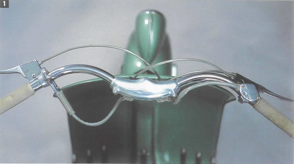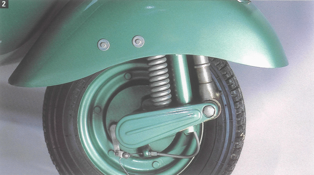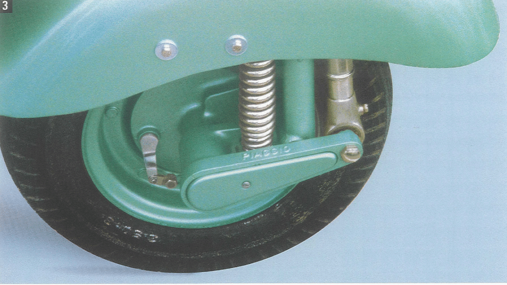 Autre curiosité, également présente sur les premiers modèles : le moyeu de la suspension avant comporte un enjoliveur encastré, fixé par une vis apparente. Le commutateur de phare devient gris avec un couvercle chromé. Les jantes sont renforcées par rapport aux modèles précédents, prolongeant la butée centrale sur l’anneau de blocage.